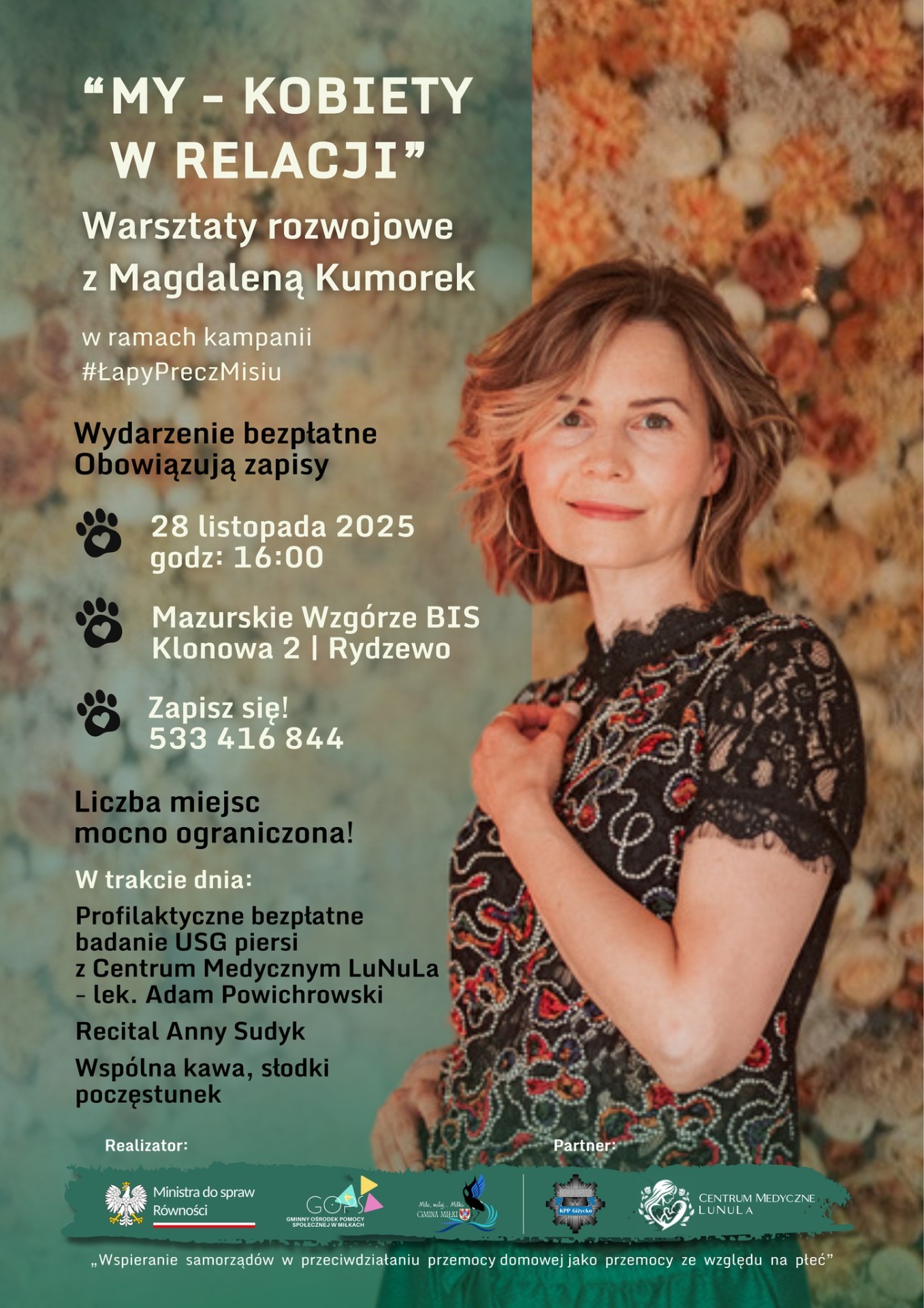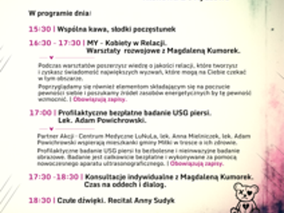 - a także zadbamy o zdrowie – lek. Adam Powichrowski przeprowadzi bezpłatne profilaktyczne badania USG piersi dla chętnych uczestniczek.