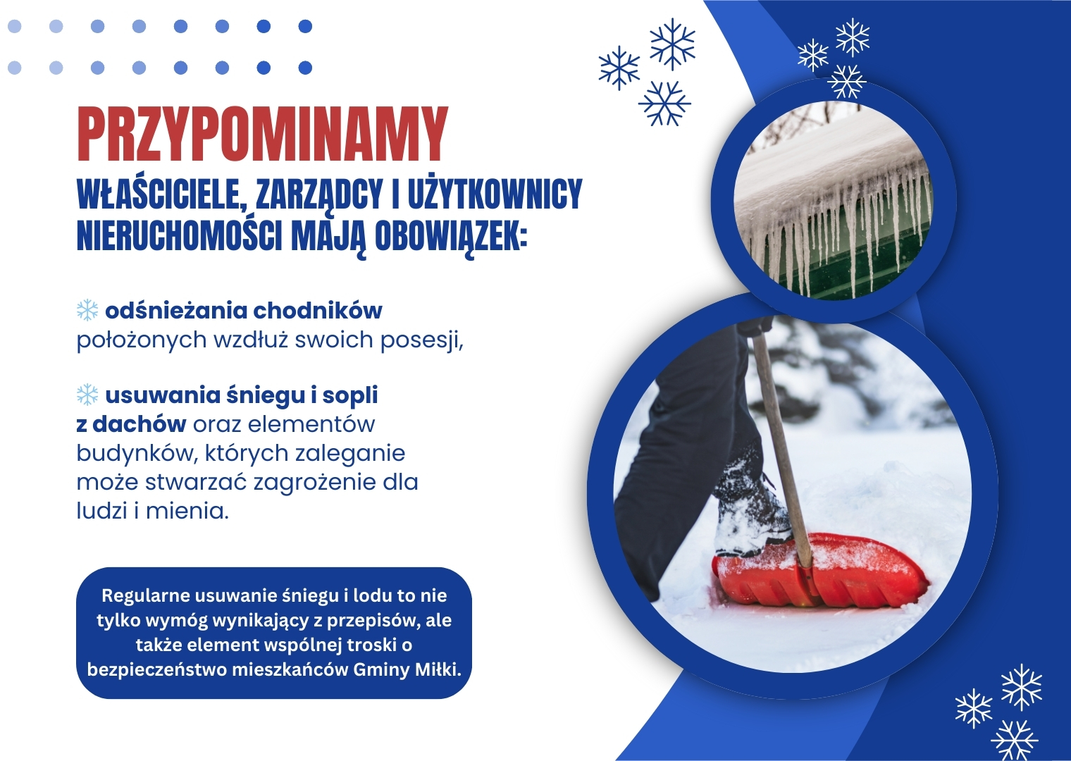 - usuwania śniegu i sopli z dachów oraz elementów budynków, które mogą stwarzać zagrożenie dla ludzi i mienia.