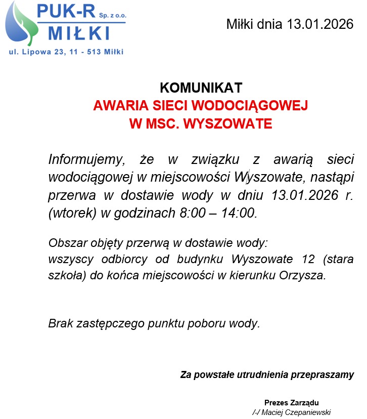 informujemy, że we wtorek 13.01.2026 r. w związku z awarią sieci wodociągowej nastąpi przerwa w dostawie wody w godz. 8:00–14:00.